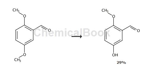 在0℃下,将浓h2so4(40ml)缓慢加入到2,5-二甲氧基甲醛(3.32g,20mmol)中。将溶液在55℃下加热并搅拌46小时。 用水淬灭反应,首先用et2o然后用naoh水溶液萃取产物。 将溶液用hcl水溶液酸化并用et2o萃取。 将溶液用mgso4干燥并蒸发浓缩。 将粗产物进行sio2柱色谱(chcl3/meoh),随后从meoh/h2o中沉淀,得到产物。 微褐色固体,产量0.9克,29%。 1h nmr(cdcl3):δ3.87(s,3h,-och3),6.57(s,1h,-oh),6.89(d,j = 9.2hz,1h),7.13(dd,ja = 9.2hz,jb = 3.1hz,1h),7.37(d,j = 3.1hz,1h),10.38(s,1h,-cho)。13cnmr(cdcl3,125mhz):δ190.53,156.58,149.95, 124.82,123.96,113.71,113.31,56.14。