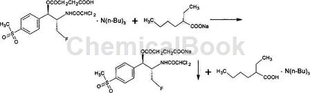 方法2:将氟尼考30g(0.084mol)、琥珀酸酐10.9g(0.109mol)及正己烷135ml,投入到干燥得反应瓶中,室温搅拌,充分混合均匀,然后降温至5℃,缓慢滴加三正丁胺15.5g(0.084mol),滴毕,5~10℃搅拌反应,薄层色谱点板跟踪确认无氟尼考原料点,为酯化反应结束。然后,于5℃,缓慢滴加异辛酸钠的溶液,于5~10℃搅拌反应3小时,固液分离,少量冷冻的漂洗滤饼,45℃真空干燥,得到氟尼考琥珀酸钠白色结晶体36.0g,含量为99.3%,摩尔收率为89.5%。