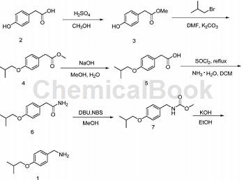 以4-羟基(2)为原料,经酯化反应生成4-羟基甲酯(3);(3)经取代反应生成4-异丁氧基甲酯(4),得到的产物(4)水解得到4-异丁氧 基(5);(5)经酰化反应生成4-异丁氧基乙酰胺(6);(6)经hofmann(霍夫曼)降解反 应生成n-(4-羟基苄基)氨基甲酸甲酯(7);(7)经水解得到目标产物(1)。