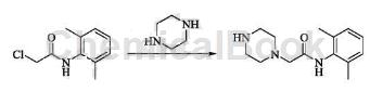 在装有机械搅拌的四口烧瓶中依次加入1-甲酰基哌嗪500g,2-氯-n-(2,6-二甲基基)乙酰胺866g,碳酸钾908g,丙酮2500ml,25℃下搅拌8h,过滤,滤液浓缩干燥,加入二氯甲烷1500ml,去离子水1000ml,静置分层,二氯甲烷层用5%的盐酸500ml洗涤,合并水层,水层中加入5mol/l的氢氧化钠调节ph至10,80℃下回流反应8h,冷却至室温,二氯甲烷萃取,干燥、浓缩得到n-(2,6-二甲基基)-2-(1-哌嗪基)乙酰胺。
