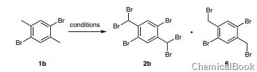 使用nbs(4.4当量)和aibn(4mol%)在回流的中使用100w白炽灯溴化1b16小时,得到对称的二溴化产物1,5-二溴-2,4-二溴甲基(6)。nbs的量进一步增加到8.8当量和反应至48小时的时间未导致双(二溴)产物2b的形成。