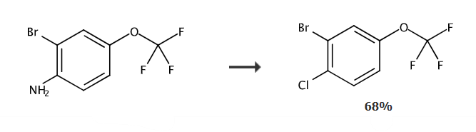 在5℃下,将亚硝酸钠(0.81g,11.72mmol)的水(2ml)溶液滴加到2-溴-4-(三氟甲氧基)胺(1.18ml,7.81mmol)的6n盐酸溶液中。将混合物在该温度下搅拌40分钟 然后,滴加cucl(1.55g,15.62mmol)的浓hcl(3ml)溶液。使混合物升温至室温,并搅拌2-6小时。加入dcm和水,并将产物萃取两次。 将合并的有机层干燥,过滤并浓缩。 通过快速柱色谱法(20g硅胶,庚烷∶acoet从100∶0至85∶15)纯化粗化合物得到2-溴-1-氯-4-三氟甲氧基(1.47g,68%)。