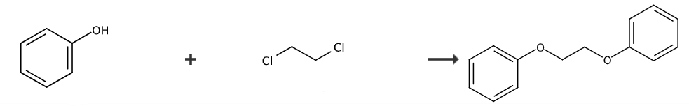 1,2-二氧乙烷(dpe)作为新型热敏材料增感剂和潜在的聚烯烃催化剂添加剂而备受关注。仅有少数文献报道了1,2-二氧乙烷合成,主要通过碱性水或乙醇介质中酚与1,2-或者乙二醇磺酸酯为起始原料反应来制备,收率据报道高可达80%,但是产品含有较多的杂质,合成的粗产品需要用高温精馏(收集温度200℃左右,真空度700pa以下)的方法来提纯。此过程能耗大,且由于产物凝固点高,容易堵塞管道,对设备提出高要求。也有以1,2-二溴乙烷和酚为原料,乙醇为溶剂,合成1,2-二氧乙烷的报道,但是产率仅有30%,反应中1,2-二溴乙烷易发生副反应转化成溴乙烯,导致低产率。