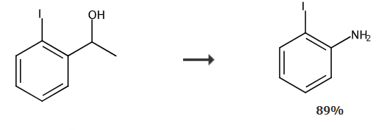 取一反应管,加入叠氮化钠50mg,1-(2-碘基)乙醇75mg,三氟300ul,甲基磺酸150ul,正己烷1.0ml,40℃下搅拌24小时。反应结束后加入氢氧化钠溶液10ml淬灭反应,用萃取3次,有机相加盐水5ml洗涤,合并有机相,柱层析分离得到邻碘胺58.4mg,产率89%。1h nmr(cdcl3,400mhz):δ7.66(d,j=7.9hz,1h),7.16(t,j=7.6hz,1h),6.77(d,j=8.0hz,1h),6.50(t,j=7.5hz,1h),4.09(s,2h);13c nmr(cdcl3,100mhz):δ146.69,138.94,129.29,119.92,114.68,84.13ppm;ms(70ev):m/z(%)=219.0.