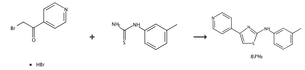 在回流温度下,将溴酮氢溴酸盐(1.13 g,4.03 mmol)和3-甲基基硫脲(0.67 g,4.03 mmol)在etoh(20 ml)中的混合物搅拌3 h。将混合物冷却至20℃,用水(50ml)稀释,将ph调节至约3。将其与nh3水溶液在8℃下混合,并将混合物在20℃下搅拌2h。过滤沉淀物,用水(5ml)洗涤并干燥。粗固体通过柱色谱法纯化,用etoac / pet的梯度(50-100%)洗脱得到n-(3-甲基基)-4-(4-吡啶)-2-噻唑胺(0.94 g,87%),为乳白色粉末。mp (etoac/pet. ether) 158-160 °c; 1h nmr δ 10.27 (br s, 1 h, nh), 8.62 (dd, j = 4.6, 1.6 hz, 2 h, h-2', h-6'), 7.84 (dd, j = 4.6, 1.6 hz, 2 h, h-3', h-5'), 7.69 (s, 1 h, h-5), 7.57 (br d, j = 7.9 hz, 1 h, h-6″), 7.47 (br s, 1 h, h-2″), 7.24 (dd, j = 7.8, 7.5 hz, 1 h, h-5″), 6.81 (br d, j = 7.5 hz, 1 h, h-4″), 2.33 (s, 3 h, ch3); 13c nmr δ 163.5, 150.1 (2), 147.6, 140.9, 140.8, 138.1, 128.8, 122.2, 119.8(2), 117.5, 114.1, 107.2, 21.2; ms m/z 268.4 (mh+, 100%). anal, calcd for c15h13n3s.bul..1/4.h2o: 5 c, 66.27; h, 5.01; n, 15.46. found: c, 64.48; h, 5.08; n, 15.08%.