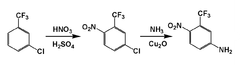 5-氨基-2-硝基三氟是一种有机中间体,可由间氯三氟通过两步制备得到。有文献报道可用于制备医药及光波导材料中间体4-溴-2-硝基三氟和非甾体类抗雄激素药物氟他胺。
