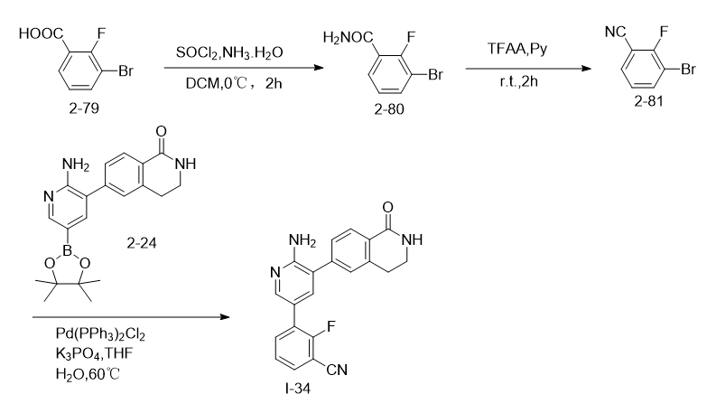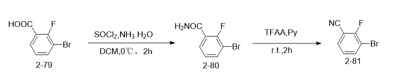 将的3-溴-2-氟甲酰胺(2-80,260 mg,1.2 mmol),tfaa(471 mg,2.4 mmol)和吡啶(py)(474 mg,6.0 mmol)在二恶烷(5 ml)中的混合物于室温搅拌4小时。反应完成后,将所得混合物用水洗涤,并用(150ml×3)萃取。合并的有机相在减压下浓缩,所得残余物通过硅胶色谱法(石油醚/= 1/1)纯化,得到中间体2-81(白色固体,100mg,42%收率)。