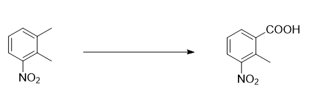 在500ml三口烧瓶中,加入20g 3-硝基邻(0.132mol)、0.164g钴(0.00066mol),然后加入正己酸76g(0.66mol),缓慢滴加9.87g(0.29mol) 双氧水,缓慢升高温度至60摄氏度,保温反应5小时,hplc检测反应,原料3-硝基邻剩余2%以下时,向反应体系加入34g(0.85mol)氢氧化钠水溶液,分液,水层用32.8g(0.90mol)盐酸调ph值至2左右,抽滤即可得到所述的2-甲基-3-硝基甲酸产物19.11g,收率80%。