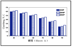 用didp替代dop时,可改善低温柔韧性和冲击性能,并能相应减少doa用量。在相同硬度条件下,didp的bell brittleness试验和clash berg试验结果都优于dop。