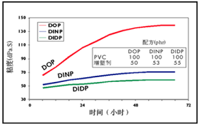 在相同效果条件下,用didp制成的增塑溶胶,其粘度低于dop制成的增塑溶胶。另外,其粘度随时间的变化也相对较低,即增塑溶胶的粘度在初始时降低,并一直保持低粘度。因此,不必使用粘度抑制剂,从而降低了成本。