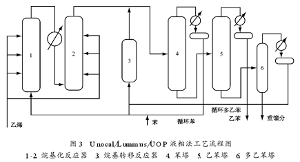 乙烯的转化率接近100% , 乙的收率较高, 循环和乙的量较小; 与乙烯的烷基化反应和多乙的烷基转移反应可在同一台反应器中完成。 缺点是反应介质的腐蚀性强, 设备造价与维修费用高以及反应产物有机相经水洗、 碱洗后产生大量含有氢氧化铝淤浆的废水, 加上废催化剂, 造成了严重的环境污染。