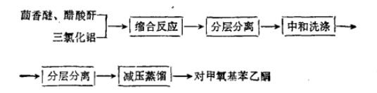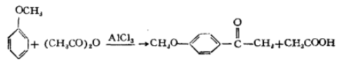1. 茴香醚在无水三氯化铝存在下,与醋酸酐或乙酰氯相作用,经乙酰化反应制取,其反应式如下: