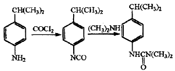 异丙隆是取代脲类除草剂,特点在于杀草谱广,主要用于小麦、大麦、棉花、花生、玉米、大豆、豌豆、蚕豆等作物田,对哺乳动物毒性很小,且具有明显的增产作用。对异丙基胺是合成异丙隆的主要原料,目前国内外异丙隆的生产都是按照光气路线进行的。合成方法如下。