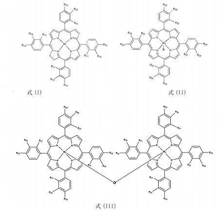 以邻硝基为原料,以乙腈、dmf、乙醇或含乙醇10%~95%体积的乙醇水溶液为溶剂,选用1~230 ppm具有下图式(i)、式(ii)或式(iii)结构的金属卟啉为催化剂,在0.3~2 mol/l氢氧化钠溶液中,通入0~0.8 mpa的氧气,在微波反应温度为60~170 ℃,微波合成功率为0~85 w的条件下,反应2~60 min,得到邻硝基甲酸。与普通方法相比,该方法由于采用微波合成邻硝基甲酸,使反应压力从现有的0.8~3mpa降低到0~0.8mpa,不仅降低了反应所需的能耗,也大大增加了反应的安全性。此外,该方法使反应时间从现有的2~12h降低到2~60min,反应时间大大缩短,显著降低了合成成本。
