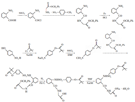 以甘氨酸卞酯对磺酸盐、对羟基磺酸、特戊酰氯和邻硝基甲酸为主要原料,首先利用邻硝基甲酸与二氯亚砜反应合成邻硝基甲酰氯,再与甘氨酸卞酯对磺酸盐共同制备邻硝基甲酰甘氨酸卞酯,氨基还原后得到邻氨基甲酰胺甘氨酸卞酯,再与由对羟基磺酸得到的对-特戊酰氧基磺酰氯反应得到n-[o-(对-特戊酰氧基磺酰胺基)甲酰]甘氨酸苄酯,还原,碱化后即得西维来司钠。
