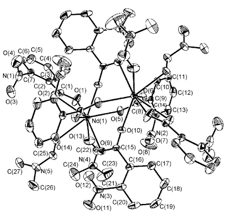 邻硝基甲酸中的羧酸根可与稀土元素形成配合物,具有很多特殊的结构和发光特性,可用于萃取分离、杀菌剂、发光及功能材料等方面。将邻硝基甲酸与硝酸钕分别用乙醇-水混合溶剂溶解,混合后加入氨水调节ph,得到淡紫色沉淀,将沉淀加入dmf溶液中,3d后得到配合物[nd(o-no2-c6h4coo)3(dmf)2]2晶体,其分子结构如下图所示。
