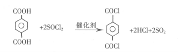以对二甲酸为原料, 在少量的催化剂n,n-二甲基甲酰胺或吡啶的作用下与氯化亚砜反应,蒸馏得到对二甲酰氯,反应过程如下图: