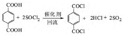 david 等人利用对二甲酸在催化剂 dmf和溶剂氯的存在下通入光气,在 90~100℃下反应,生成对二甲酰氯。产物熔点 80.4℃,收率 84.0%。反应过程如下: