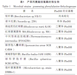 之后一些学者陆续从另一些微生物中分离筛选到产phedh的菌株现已报道的产phedh的生物大多属于好氧的革兰氏阳性细菌或放线菌表1。通过基因工程构建的工程菌株也可以表达产生重组丙氨酸脱氢酶1987年asano等将丙氨酸脱氢酶基因在大肠杆菌中克隆并表达获得了较高的表达量培养液中酶总活性和比活性分别可达6890ul和7.05umg并且提纯的重组phedh酶的性质与天然phedh酶相类似。