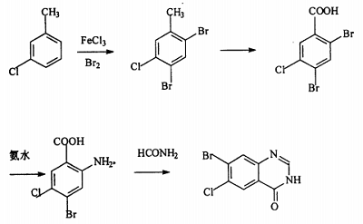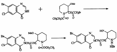 氢溴酸常山酮即7-溴-6-氯-3-[3-(3-羟基-2-哌啶基)-2-氧代丙基]-4(3h)-喹啉酮,属于天然生物碱,早作为兽药使用,在抗家禽球虫病方面有独特的功效。以3-氯为原料,三氯化铁为催化剂,与溴丁烷及溴发生溴化反应得到2,4-二溴-5-氯,通过高锰酸钾、重铬酸钾或二氧化镁将甲基转变为羧基,得到2,4-二溴-5-氯酸,在氯化亚铜存在下与氨水或者氨气反应,选择性将其邻位溴氨化,得到2-甲基-4-溴-5-氯甲酸,再使用甲酰胺在dmf溶液中环化得到7-溴-6-氯-4(3h)-喹啉酮,后与2-溴丙酮基-3-甲氧基-1-哌啶羧酸乙酯缩合、水解、脱甲基,即制得氢溴酸常山酮。其反应过程如下。