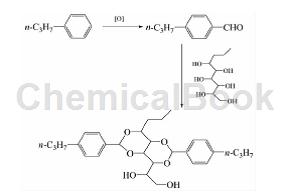 2010 年美利肯化工推出了新一代聚丙烯透明剂millad nx 8000,其所能达到的透明度增加了许多商机,millad nx 8000 使得透明聚丙烯看起来近似聚乙烯和聚碳酯,因而使材料取代成为了可能。透明聚丙烯应用领域包括:食品容器(高端顾客对更高透明度的追求);包装材料(取代高成本塑料,如聚碳酸酯、聚氯乙烯、聚乙烯和共聚聚酯等);婴儿奶瓶(取代聚碳酸酯,基于成本及内分泌腺的安全考虑);挤吹塑料瓶(化妆品容器等)。有关millad nx 8000 聚丙烯透明剂的合成方面,美利肯公司申请了大量的专利。合成路线以正丙为原料合成4-正丙基甲醛,然后再与山梨醇衍生物反应,反应式如下。