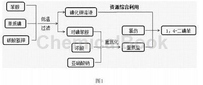 为了简化反应步骤,化学工作者采用对碘胺重氮化,再与碘化钾进行置换反应,得到产品1,4-二碘。由于对碘胺来源稀少,不易保存且价格较高,难以在工业中规模化应用。