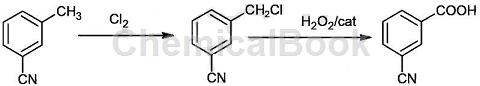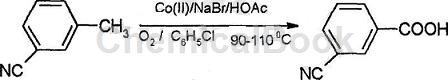 方法1:一种工艺简单和生产成本低的制备间-氰基甲酸的方法。该目的通过采用以下工艺得以实现:以间-氰基 为原料,以氯为溶剂;以醋酸钴为催化剂,以溴化钠和冰醋 酸为助催化剂,混合制成反应液,然后通入过量氧气,一步氧化,经分离,制得产品。制备步骤: