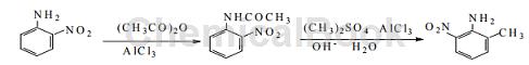 方法3:以邻硝基胺为:原料,经乙酰化反应、甲基化反应,后水解得到 2-甲基-6-硝基胺。反应步骤简单,并且用不到强酸性物质,对生产设备要求不高,温度容易控制,操作简单方便。用该方法合成的的 2-甲基-6- 硝基胺产率高达 93.9%,大大提高了产率,且产 物纯度为 99.6%,满足市场需求,适用于工业化大 规模生产。目标产物的合成路线如下: