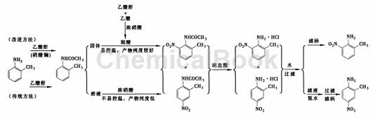 针对传统一锅煮方法存在的缺陷,有研究将乙酰化反应和硝化反应分步实施,即首先制备出乙酰化产物,然后将其加入事先配好的硝化试剂中得到乙酰化的硝化产物混合物,用盐酸水解得 2-甲基-6-硝基胺和 2-甲基-4-硝基胺盐酸盐混合液,再用水稀释盐酸盐即得 2-甲基 -6-硝基胺,产率高为 59.4%,纯度 99%以上 。改进后的方法硝化反应温度容易控制,对设备和操作无特殊要求,较适于大规模工业化生产 。
