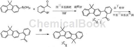 此外,还有研究另外提供一种6,6,12,12-四甲基-6,12-二氢茚并[1,2-b]芴的制备方法。该方法包括:偶联反应:2’-溴乙酮与9,9-二甲基芴-2-硼酸进行偶联反应,生成式m-1所示化合物;加成反应:式m-1所示化合物和甲基溴化镁进行加成反应,然后水解,生成式m-2所示化合物;环合反应:式m-2所示化合物酸存在下进行环合反应,转化为式m所示的6,6,12,12-四甲基-6,12-二氢茚并[1,2-b]芴。上述制备方法,工艺简单、容易操作;所需原料易得、成本低廉;且收率高达81~91%,适合大规模生产。