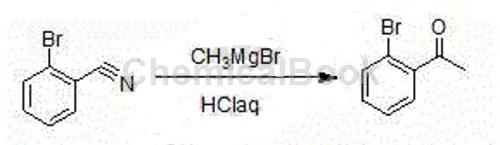 方法1:高纯度2’-溴乙酮合成方法包括以下步骤:在一容器内加入甲基溴化镁格氏试剂,常温条件下,滴加邻溴腈的四氢呋喃溶液,加完后会有大量的白色固体出现;hplc图谱检测没有原料时,停止反应;滴加到盐酸溶液中,分液、旋干、减压蒸馏就可得到无色液体产品(高纯度的2’-溴乙酮产品)。邻溴腈和甲基溴化镁的摩尔比为1:1.05。详细的步骤如下:投料量如下:邻溴腈:91g,甲基溴化镁(2m):262.5ml,thf(tetrahydrofuran,四氢呋喃):90ml,浓盐酸:60ml,:300ml。在500ml反应瓶中加入甲基溴化镁(2m)262.5ml,控制反应温度在20-25℃滴加91g邻溴腈和90mlthf溶液,控制反应温度在20-25℃,约2小时滴加完,加完后会有大量的白色固体出现。再在此温度下反应1小时。用hplc监测反应情况,当反应液原料消失时,停止反应,将反应液滴加到60ml浓盐酸和300ml水中,分液,水相用300ml萃取,合并有机相,再用200ml水洗,减压-0.095mpa浓缩至不再有液体馏出。减压蒸馏,收集131-135℃(-0.095mpa)馏分,得到95g无色透明液体2’-溴乙酮。测定密度:1.48(20℃),反应收率(以邻溴腈计)95.5%。