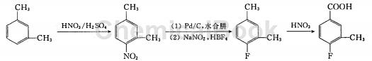 4-氟-3-甲基甲酸是一种重要的含氟医药、农药、染料中间体,如用于合成抗炎消菌药、外科手术用局部麻醉剂、有机氟杀虫剂、除草剂、植物生长调节剂等。将异丁基锂,对氟甲酸,碘甲烷在-78℃下两步合成了 4-氟-3-甲基甲酸,该方法对温度要求苛刻、反应选择性差、异构体分离困难、产率低。以间为原料,经混酸硝化合成了 4-硝基间,然后将其还原,合成出 4-氨基间,再重氮氟化合成了 4-氟间,后用稀硝酸在高压釜中选择性氧化合成了4-氟-3-甲基甲酸。