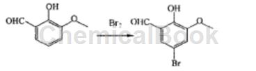 具体步骤如下:在1 l的圆底烧瓶中加入邻香兰素(16 g),然后加入冰醋酸(80 g)、溴化钾(25 g)和40 ml水,在反应液加热到i00℃,然后滴加液溴(17.5 g),在50min时间加完,在io0℃反应90 min,降温至70℃,减压蒸去大部分溶剂,然后加入1l水,用冰水冷却至0~5℃,保温2 h,离心分离出产品,用2×10 ml水洗涤产品,真空干燥21 h,产率:14.8g(92.5%)。
