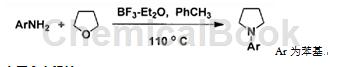1-基吡咯烷(1)的合成如下:在氩气保护,室温下将0.15ml(1.2mmol,170.3mg)三氟化硼溶液和0.1ml(1mmol,93mg)胺加入到4ml新蒸的中,室温搅拌60min,然后加入1.0ml(10mmol)四氢呋喃,缓慢升温至110℃,回流24h。将反应体系降至室温,加入10ml饱和碳酸氢钠溶液,充分搅拌后用二氯甲烷(3×10ml)萃取,合并有机相,用无水钠干燥。旋转蒸发除去溶剂,以石油醚(60-90℃)∶二氯甲烷=1∶4(体积比)为展开剂通过硅胶柱色谱分离得到产物淡黄色油状物87mg,产率59%。其核磁数据如下:1h nmr(溶剂:cdcl 3 ,化学位移):δ1.96-1.99(m,4h),3.25-3.28(m,4h),6.56(d,j=7.9hz,2h),6.64(t,j=7.3hz,1h),7.21(td,j=6.8,0.9hz,2h);13c nmr(溶剂:cdcl 3 ,化学位移):δ25.7,47.8,111.9,115.6,129.3,148.2;