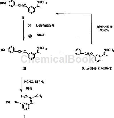 2)(s)-间苄氧基-α,n-二甲基苄胺(iii)在醇溶液中加甲醛溶液或聚甲醛,雷氏镍催化,室温,常压或低压氢化,胺甲基化同时去苄基,得(s)-3-(1-二甲氨基乙基)酚(i);