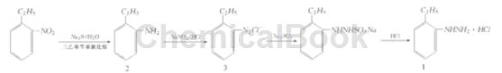 方法1:以生产对乙基硝基的副产物邻乙基硝基为原料,氯化三乙基苄基铵为相转移催化剂,用硫化钠还原为邻乙基胺( 2)。然后将2重氮化,再用亚钠还原邻乙基重氮得邻乙基肼磺酸盐,续加盐酸酸析得1。以邻乙基硝基计,总收率为86. 4% ,