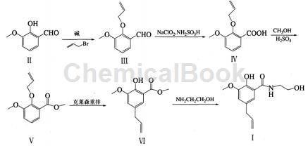 欧阳红霞等人以邻香兰素(ⅱ) 为原料,首先经过烯丙基化反应得到 3-甲氧基- 2-( 2-丙烯氧基) 甲醛(ⅲ),然后用价廉易得的无机氧化剂亚氯酸钠和氨基磺酸在丙酮-水的混合溶剂中将醛氧化成相应的酸(ⅳ),再经甲酯化反应得到 3-甲氧基- 2-( 2-丙烯氧基) 甲酸甲酯 (ⅴ),后经重排和氨解反应得到目标产物-阿利多(ⅰ) 。此路线原料易得,克服了上述方法的诸多缺点,易于实现工业化。
