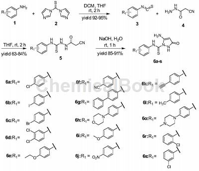 其中,x为o或s,优选s;r1为氢,或者位于环的任意位置的单取代基或多取代基,各取代基独立地为卤素、低级烷基、低级卤代烷基、低级羟基烷基、低级烷氧基、低级烷基氨基、低级卤代烷氧基、低级卤代烷基氨基、低级环烷基氨基、低级链炔基氨基、酰胺基、低级环烷基酰胺基、低级酰胺基烷基、苄基、取代苄基、硝基、乙炔基、吗啉基、取代哌嗪基或腈基;r2为氢,取代或未取代的芳香环、脂肪环,或低级酰基;r3和r4一个为氨基,另一个为羰基氧。4-溴基异硫氰酸酯可用于制备化合物6c,路线如下所示: