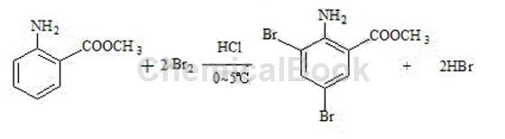 3,5-二溴邻氨基甲酸甲酯可用作医药化工合成中间体。如合成盐酸溴己新,别名:溴己新、必消痰、必嗽平,化学名称:n-(2-氨基-3,5-二溴苄基)-n-环己烷基甲胺盐酸盐,英文名称bromhexini ,盐酸溴己新为鸭咀花硷(vasicine)经结构改造得到的合成药物,常用其盐酸盐。系白色至类白色结晶性粉末,易溶于甲醇、乙醇,略溶于水。主要用于气管、支气管粘膜腺体的粘液产生细胞,使之分泌粘滞性较低的小分子粘蛋白,并因此使气管、支气管分泌的流变学特性恢复正常,粘痰减少、痰液稀释,易于咯出。