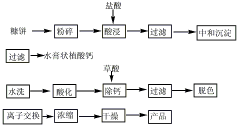(2)在50~60℃下将碎米糠浸泡在ph值为2的稀盐酸中4~6h,过滤后滤渣再浸泡2h,并过滤弃渣;合并2次滤液,静置l0h,吸取上清液;将适量的ca(oh)2和mg(oh)2加入清液中,并用naoh溶液调ph值从3.4至7.0,搅拌15min后静置2~3h;弃上清液,过滤,滤渣依次用ph值为7.5的碱水溶液和蒸馏水洗涤,得植酸钙镁盐,收率为95%~98%。
