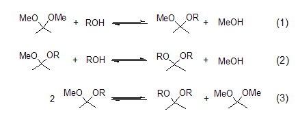 缩醛的形成 通过缩醛化反应,2,2-二甲氧基丙烷可制备不同类型的缩醛。此反应过程包括甲氧基或酮基在酸性介质中的交换[1]。当2,2-二甲氧基丙烷、醇和催化量的酸混合时有3个平衡反应 (式1~式3)。生成的甲醇蒸馏除去,有利于缩醛反应的进行。甲醇和2,2-二甲氧基丙烷形成二元共沸物,加入烷烃溶剂 (如己烷或) 会破坏此共沸物。