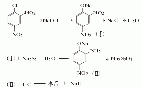 由2,4-二硝基氯水解,用多硫化钠部分还原的方法制得。原料消耗定额:2,4-二硝基氯(工业品)2100kg/t、液碱(40%)2050kg/t、多硫化钠(100%)700kg/t、盐酸(37%)150kg/t。