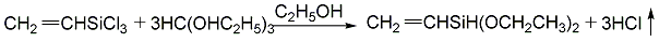 也可先合成乙烯基三氯硅烷,再使用乙烯基三氯硅烷与乙醇加热反应制得乙烯基三乙氧基硅烷;或在乙醇存在的条件下将乙烯基三氯硅烷与原甲酸三乙酯一起共热制得: