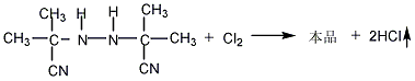 (4)将二异丁腈肼冷却降温至10℃以下,边搅拌,边从釜底通入氯气,温度会略有升高,需控制在20℃以下。尾气用水、碱吸收。氧化反应完毕后 ,静置沉降,过滤,滤液回收利用,滤饼用水洗涤,分去水后,获粗品偶氮二异丁腈。