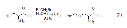 含硫化合物如硫醇、硅基硫醚等也能在碱性条件下与苄溴发生反应,如l-半胱氨酸与苄溴在氢氧化钠碱液中的反应 (式2)。在dmf溶剂或羰基锌的作用下,苄溴也能与羧酸阴离子反应制备苄基羧酸酯化合物[6]。