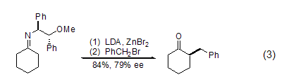 苄溴还能与带活泼亚甲基的化合物如烯醇式酮、酯、1,3-二羰基化合物、酰胺、内酰胺以及硝基稳定的碳阴离子发生烷基化反应。如苄溴与金属烯胺在手性亚胺作用下发生的苄基化反应能够获得较好的对映选择性 (式3)[7]。