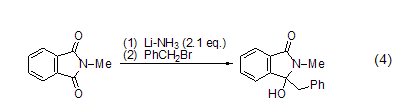 苄溴倾向于与有机金属化合物如烷基锂、格氏试剂、烷基酮等发生偶联反应。如苄溴与n-甲基邻二甲酰亚胺在li的作用下发生的偶联反应 (式4)[9]。