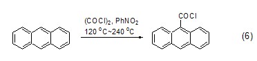 草酰氯还能直接为烷烃或环烷烃化合物引入氯羰基团,不过通常反应得到的是混合物。芳香烃化合物在草酰氯和路易斯酸作用下也能发生氯羰基化反应,其中,蒽在没有催化剂存在下也能直接发生反应 (式6)[6]。