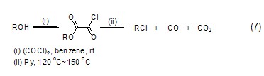 醇类化合物与草酰氯反应能得到乙二酰单烷基酯,进而在加热条件下转变为氯代烷烃化合物 (式7)[7]。