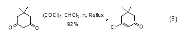 草酰氯与于1,3-二酮反应,能高产率地生成β-氯烯烃环化物 (式8)[8]。